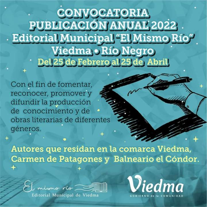 El gobierno de Viedma a través de la Editorial Municipal, lanzará su primera convocatoria para publicación de obras, dirigida a autores que residan en la Comarca y balneario el Cóndor.