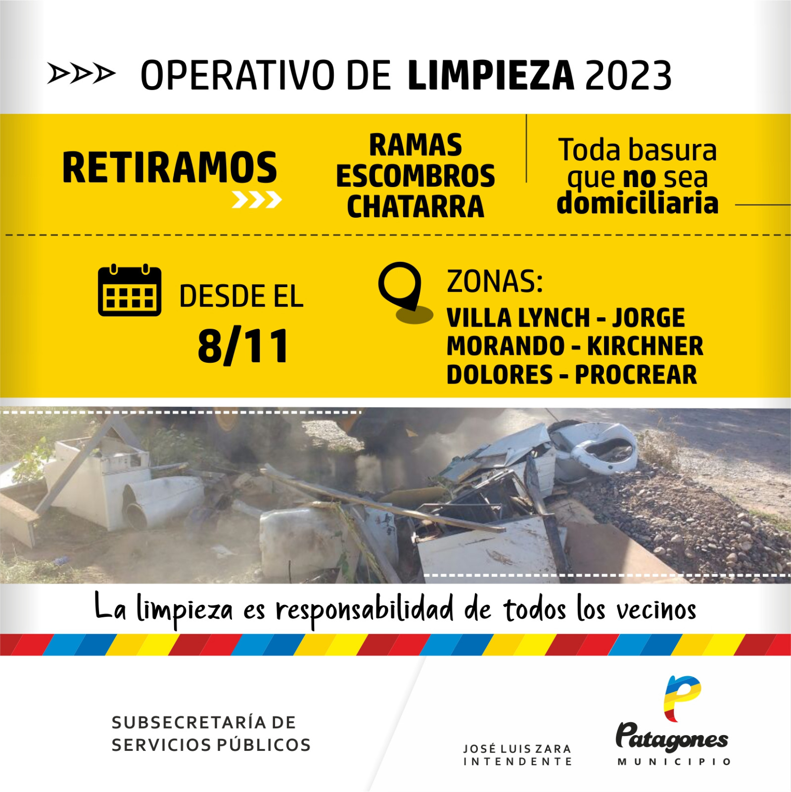 En el marco del cronograma dispuesto por el área de Servicios, se informa a la comunidad que, a partir del miércoles 8 de noviembre, el operativo de limpieza se trasladará a los barrios Villa Lynch, Jorge, Morando, Dolores, Kirchner y Procrear, de Carmen de Patagones.