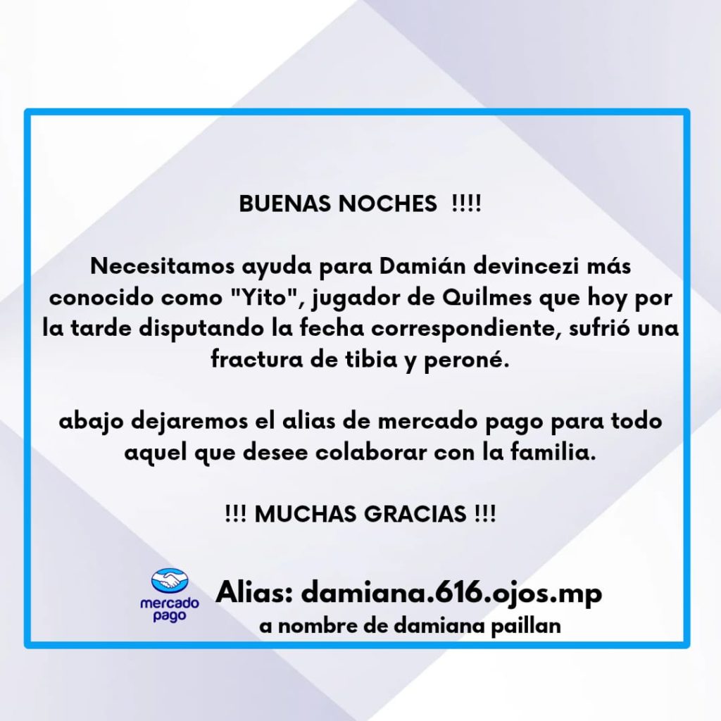 Aquellas personas que puedan colaborar deben comunicarse con el club Quilmes de Patagones a través de sus redes sociales o enviar la colaboración al siguiente alias: damiana.616.ojos.mp a nombre de damiana paillan
