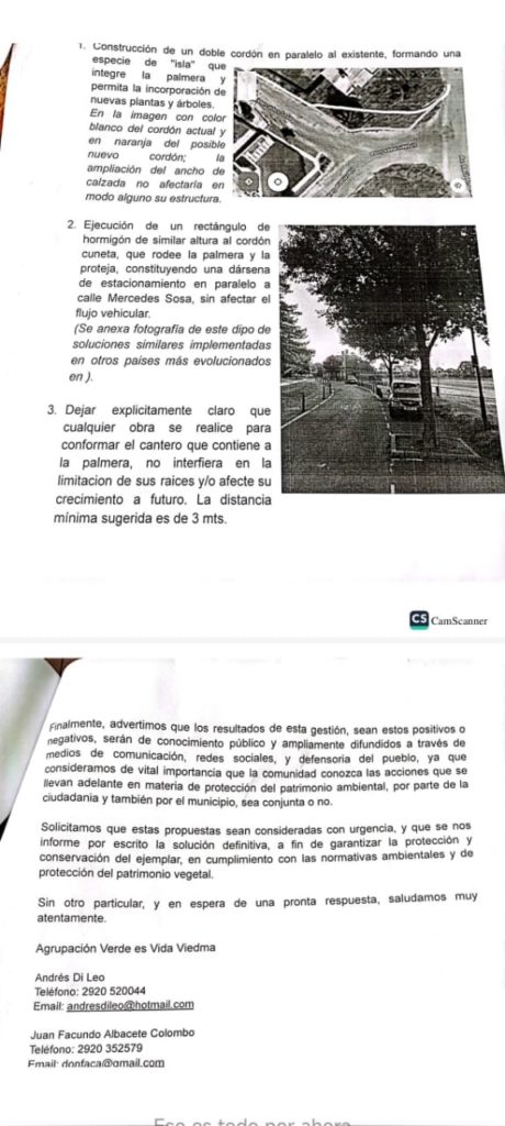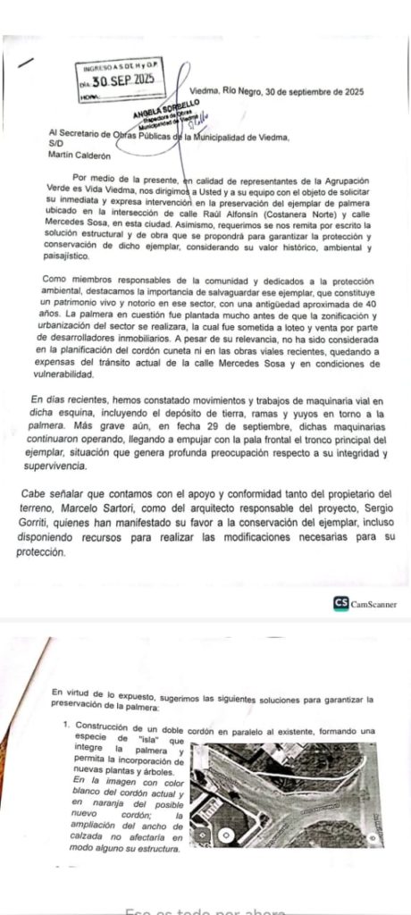 El grupo ambientalista Verde es Vida Viedma presentó una nota al secretario de Obras Públicas de la Municipalidad de Viedma para solicitar precisiones sobre la obra definitiva que permita conservar la histórica palmera ubicada en la intersección de Costanera Norte y calle Mercedes Sosa.
