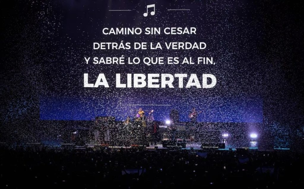 El recital comenzó con una potente versión de Demoliendo Hoteles, el clásico de Charly García, y continuó con El rock del gato de Los Ratones Paranoicos, Blues del equipaje de La Mississippi y una encendida interpretación de No me arrepiento de este amor en la versión punk de Attaque 77. Más tarde, sorprendió al público al entonar Libre, de Nino Bravo, cargada de referencias simbólicas al comunismo y a la caída del Muro de Berlín. Incluso reversionó Tu vicio, también de Charly García, adaptando la letra y gritando con fuerza: “¡Soy un liberal!”.