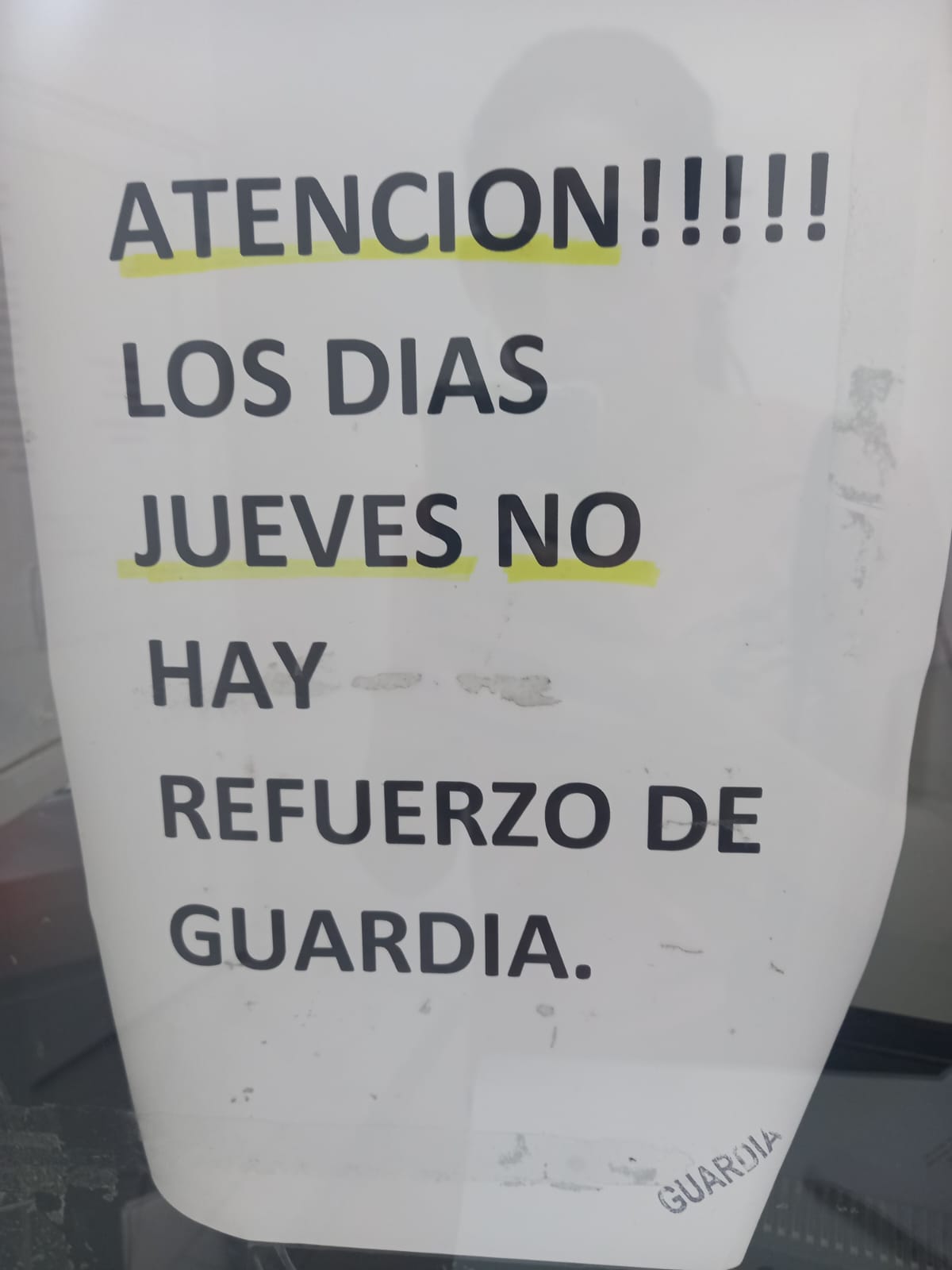 “ATENCIÓN: los días jueves no hay refuerzo de guardia.”