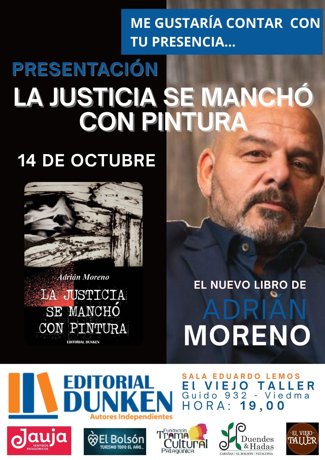 El periodista y escritor Adrián Moreno presentará su nuevo libro “La Justicia se manchó con pintura” este martes 14 de octubre a las 19 horas, en la Sala Eduardo Lemos del Centro Cultural El Viejo Taller, ubicada en Guido 932 de Viedma.