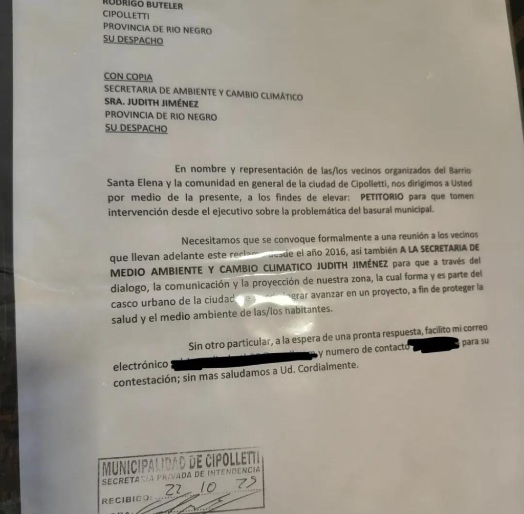 El documento, acompañado por más de 300 firmas de vecinos, fue entregado este martes 22 de octubre en la Secretaría Privada de Intendencia del municipio, con copia a la secretaria provincial de Ambiente, Judith Jiménez. En el texto, los vecinos solicitan que se convoque formalmente a una reunión con las autoridades locales y provinciales para abordar la situación que —según denuncian— viene afectando la salud y la calidad de vida de la comunidad desde hace años.
