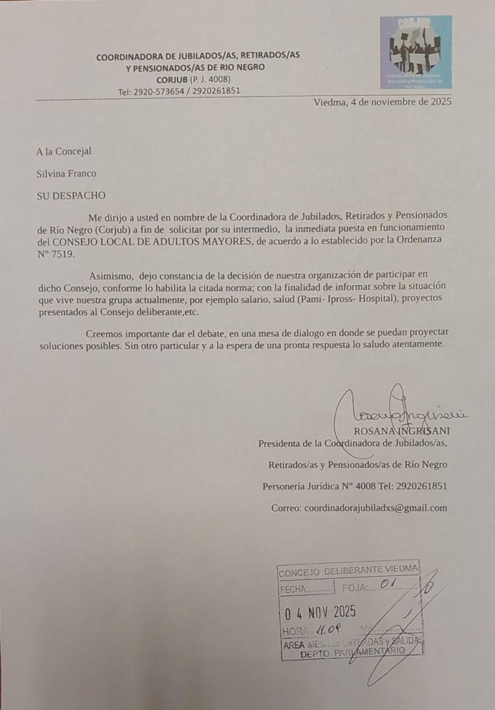 Desde la institución solicitan el funcionamiento del Consejo Local de Adultos Mayores presidido por la concejal Evelyn Rousiot. Durante este año 2025 no se llamó a ninguna reunión y hace varios años que no se reúnen sus integrantes.