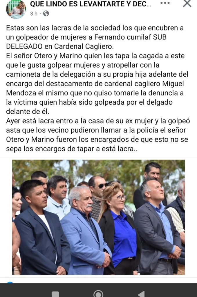 En los últimos días se viralizaron en redes sociales diversas publicaciones que denuncian al delegado de Cardenal Cagliero, Fernando Cumilaf, por presuntos episodios de violencia física y psicológica contra su ex-pareja y sus hijas menores.