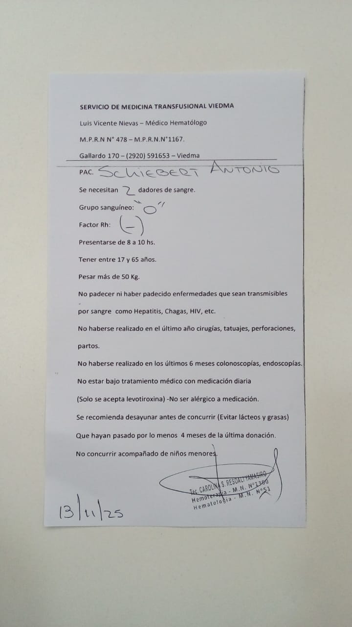 Desde el Servicio de Medicina Transfusional de Viedma se solicita, con carácter urgente, la colaboración de la comunidad para reunir dadores de sangre grupo 0 negativo (0-) destinados al paciente Antonio Schiebert, actualmente internado en el Sanatorio Austral.