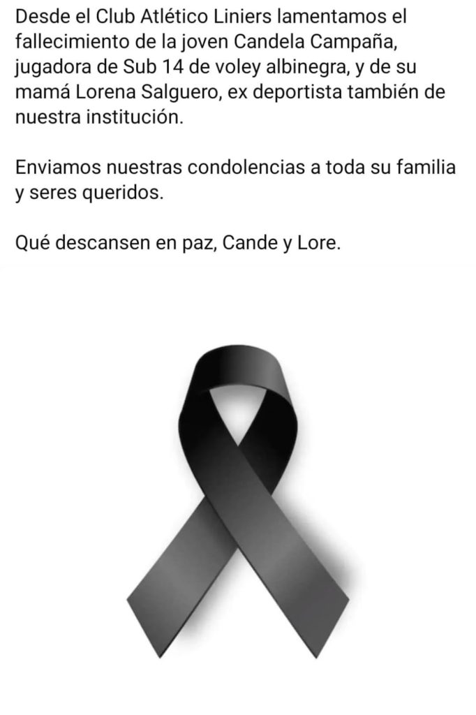 En horas de la tarde, el Club Atlético Liniers emitió un comunicado, ya que Candela era jugadora de Vóley de la entidad de la avenida Alem: “Lamentamos el fallecimiento de la joven Candela Campaña, jugadora del Sub 14 de Vóley albinegra, y de su mamá Lorena Salguero, ex deportista también de nuestra institución”. “Enviamos nuestras condolencias a toda su familia y seres queridos. Que descansen en paz, Cande y Lore”, cerró el escrito.