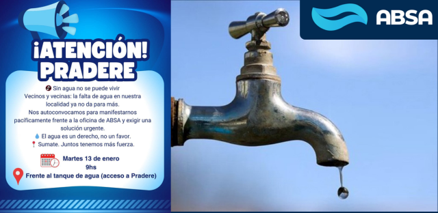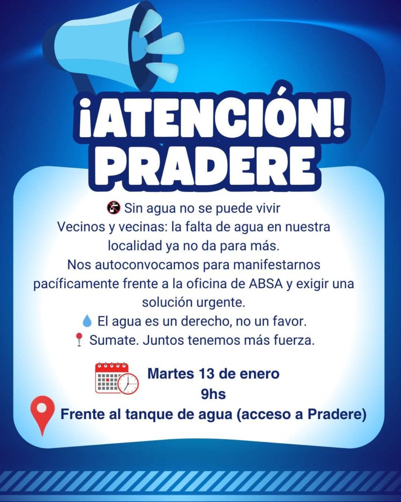 Bajo el lema «Sin agua no se puede vivir», los habitantes de la localidad se manifestarán este martes 13 de enero frente al tanque de agua para exigir soluciones urgentes a la empresa ABSA y a las autoridades locales.