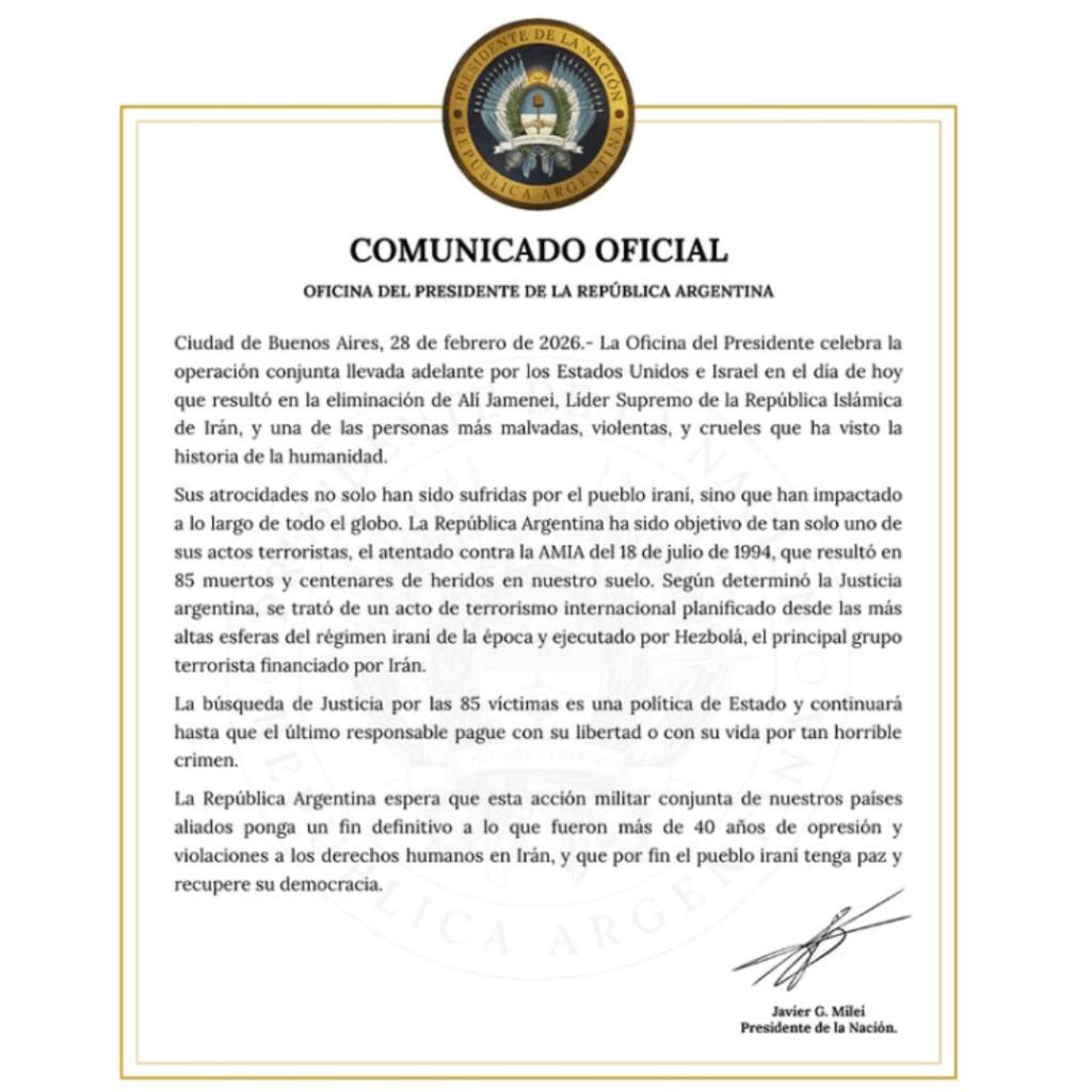 A través de un comunicado en redes sociales, el Gobierno reafirmó su «compromiso indeclinable con la defensa de la vida y la libertad». Por su parte, la Cancillería argentina puso a disposición números de emergencia para los ciudadanos residentes en la zona de conflicto: