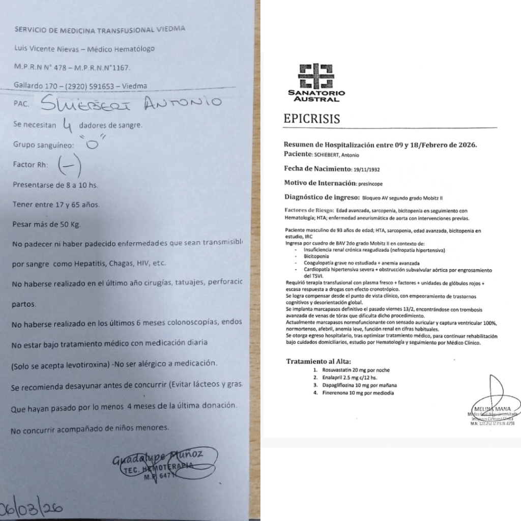 Según el informe médico, el paciente posee un grupo sanguíneo 0 (cero) Factor Rh Negativo (-), lo que hace que la búsqueda de voluntarios sea prioritaria dada la especificidad del tipo de sangre.