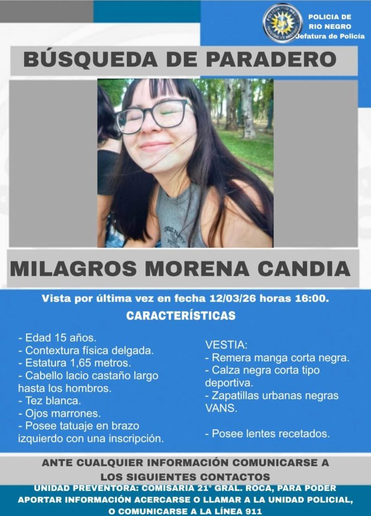 La Policía de Río Negro ha emitido un comunicado oficial solicitando la colaboración inmediata de la comunidad para dar con el paradero de Milagros Morena Candia, una adolescente de 15 años que desapareció en las últimas horas en la ciudad de General Roca.