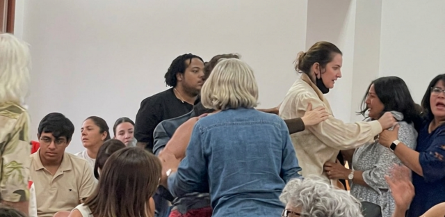 Tras los indicentes, la charla fue suspendida.