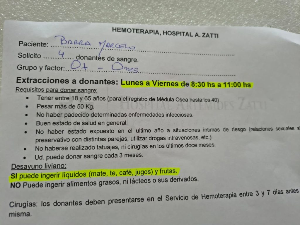 Ahora la familia solicita dadores de sangre. Quienes puedas colaborar, favor de acercarse al hospital A. Zatti de lunes a viernes de 8:30 hs a 11:00 hs.