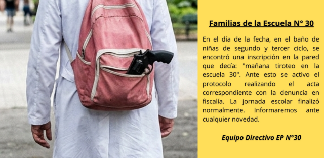 El mensaje, escrito en una de las paredes, rezaba textualmente: «Mañana tiroteo en la escuela 30». Ante la gravedad del hecho, el Equipo Directivo de la EP N°30 emitió un comunicado oficial informando que se activó de inmediato el protocolo de seguridad institucional.